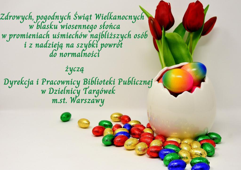 kartka wielkanocna; 5 tulipanów i duże białe jajko, stłuczone u góry; w jajku są kolorowe jajka wielkanocne; dookoła jajka też są rozsypane kolorowe jajka wielkanocne; tekst życzeń: Zdrowych, pogodnych świąt wielkanocnych w blasku wiosennego słońca, w promieniach uśmiechów najbliższych osób i z nadzieją na szybki powrót do normalności życzą Dyrekcja i pracownicy Biblioteki Publicznej w Dzielnicy Targówek m.st. Warszawy