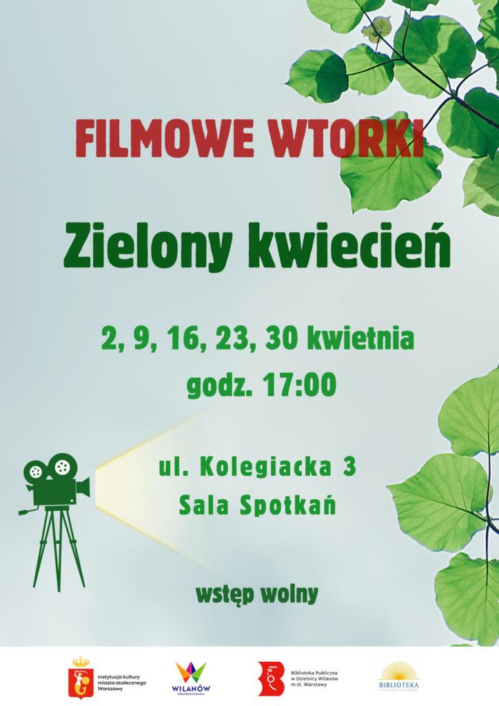 Podczas kwietniowych pokazów będzie zielono. Wszak to kolor uspokajający, związany z życiem, przyrodą, nadzieją. Zieleń aż prosi się o swój akcent w naszym filmowym cyklu i to z różnych punktów widzenia. Obiecujemy, że będzie różnorodnie, gdyż wybraliśmy dla Was dramat kostiumowy, komedię, film przyrodniczy, kryminał z romansowym wątkiem i animację fantasy.