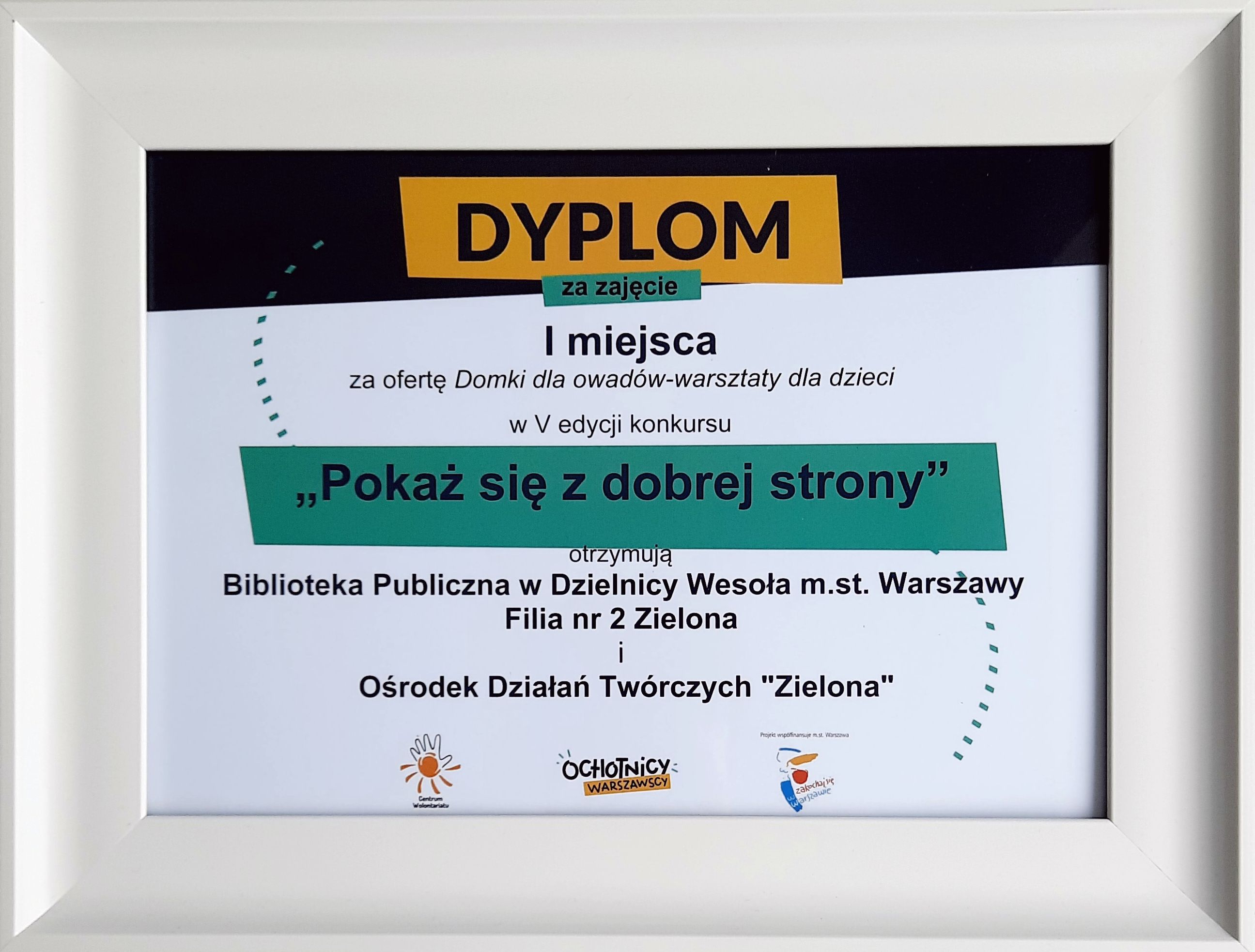 Biblioteka w Zielonej razem z Ośrodkiem Działań Twórczych „Zielona” zdobyli I miejsce w konkursie „Pokaż się z dobrej strony” na najlepszą ofertę wolontariacką w Warszawie w 2021 roku. W konkursie wzięły udział wszystkie ogłoszenia opublikowane na Miejskim Portalu Wolontariatu Ochotnicy Warszawscy!