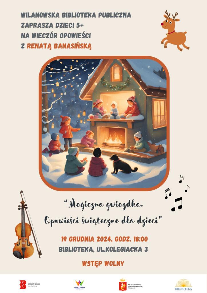 Jasne tło, w prawym górnym rogu grafika renifera, w lewym dolnym rogu grafika skrzypiec. Na środku grafika dzieci w domu i przy kominku oraz nutek. Na dole biały pasek z logotypami. Tekst: " Wilanowska Biblioteka Publiczna zaprasza dzieci 5+ na wieczór opowieści z Renatą Banasińską. Magiczna gwiazdka. Opowieści świąteczne dla dzieci. 19 grudnia, godz. 18:00. Biblioteka, ul. Kolegiacka 3. Wstęp wolny."