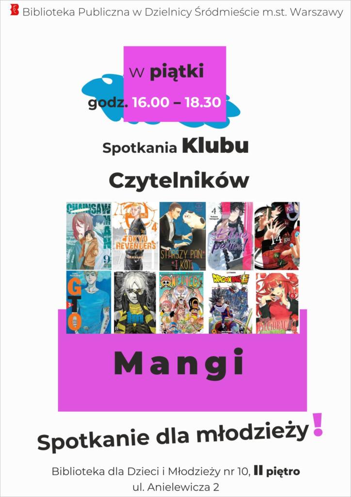 Biblioteka Publiczna w Dzielnicy Śródmieście m.st. Warszawy zaprasza w piątki w godzinach 16:00-18:30 na Spotkania Klubu Czytelników Mangi. Spotkania dla młodzieży odbywać się będą w Bibliotece Nr 10 przy ul. Anielewicza 2.