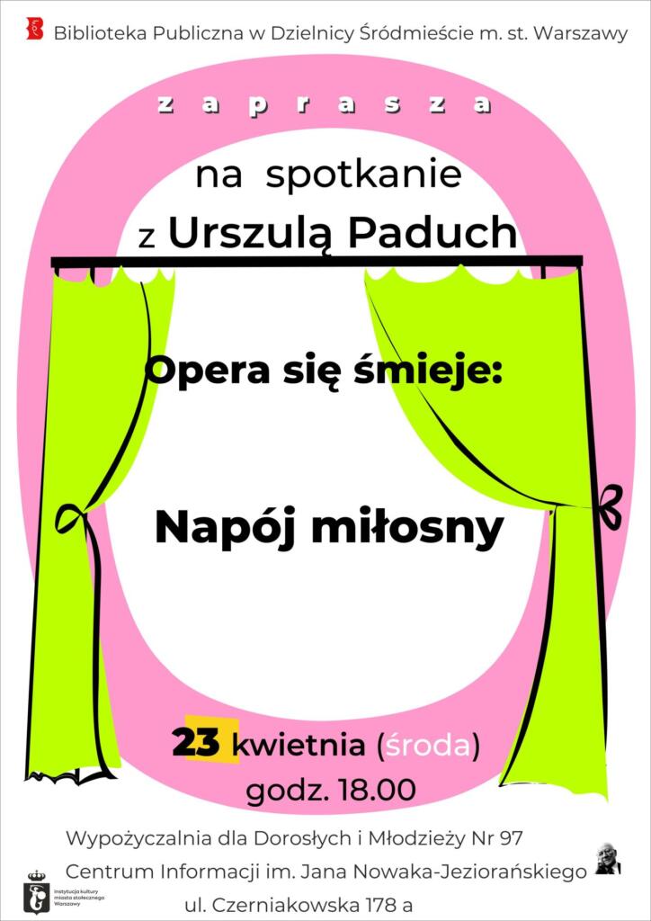 Biblioteka Publiczna w Dzielnicy Śródmieście m.st. Warszawy zaprasza na spotkanie z Urszulą Paduch pt. „Opera się śmieje: Napój miłosny”.