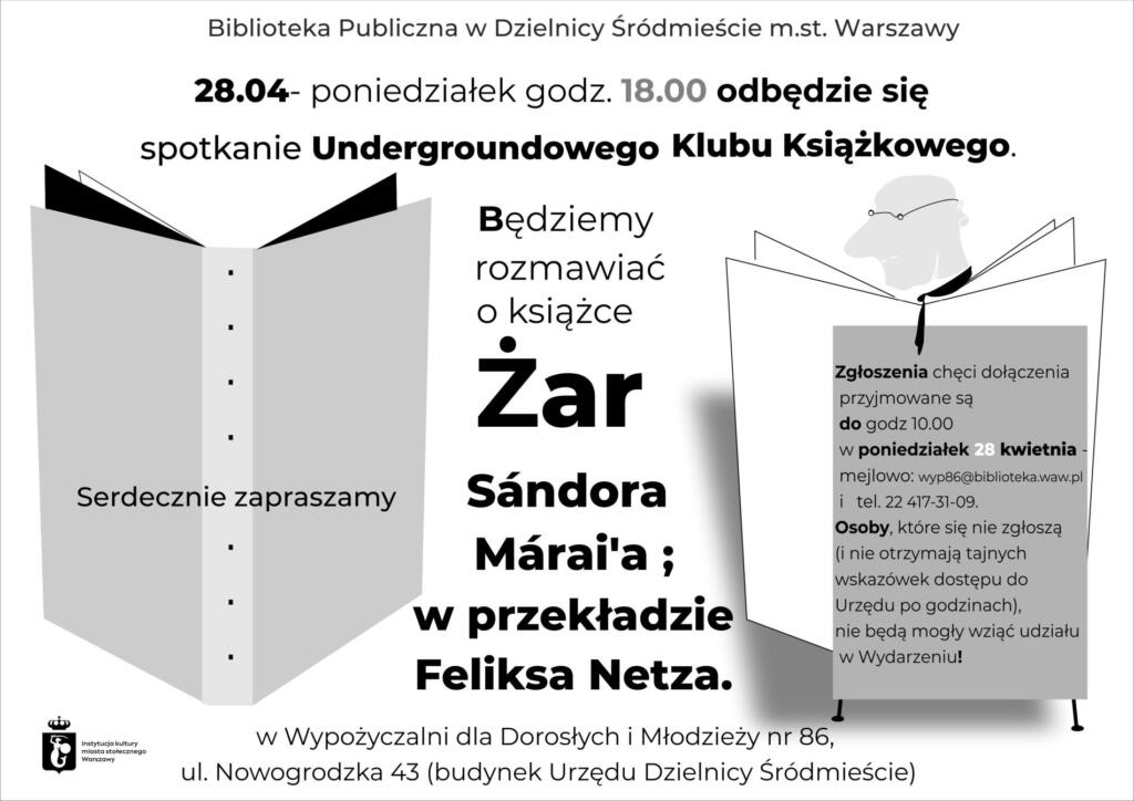 28 kwietnia o godzinie 18:00 na spotkanie Undergroundowego Klubu Książkowego. Porozmawiamy o książce „Żar” – Sándora Márai’a,