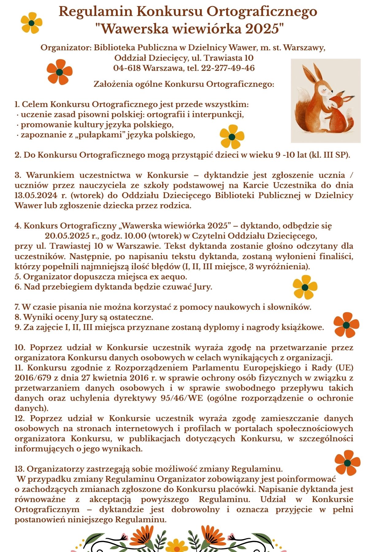 Oddział Dziecięcy zaprasza uczniów z klas trzecich szkoły podstawowej do wzięcia udziału w konkursie ortograficznym „Wawerska wiewiórka 2025”🐿