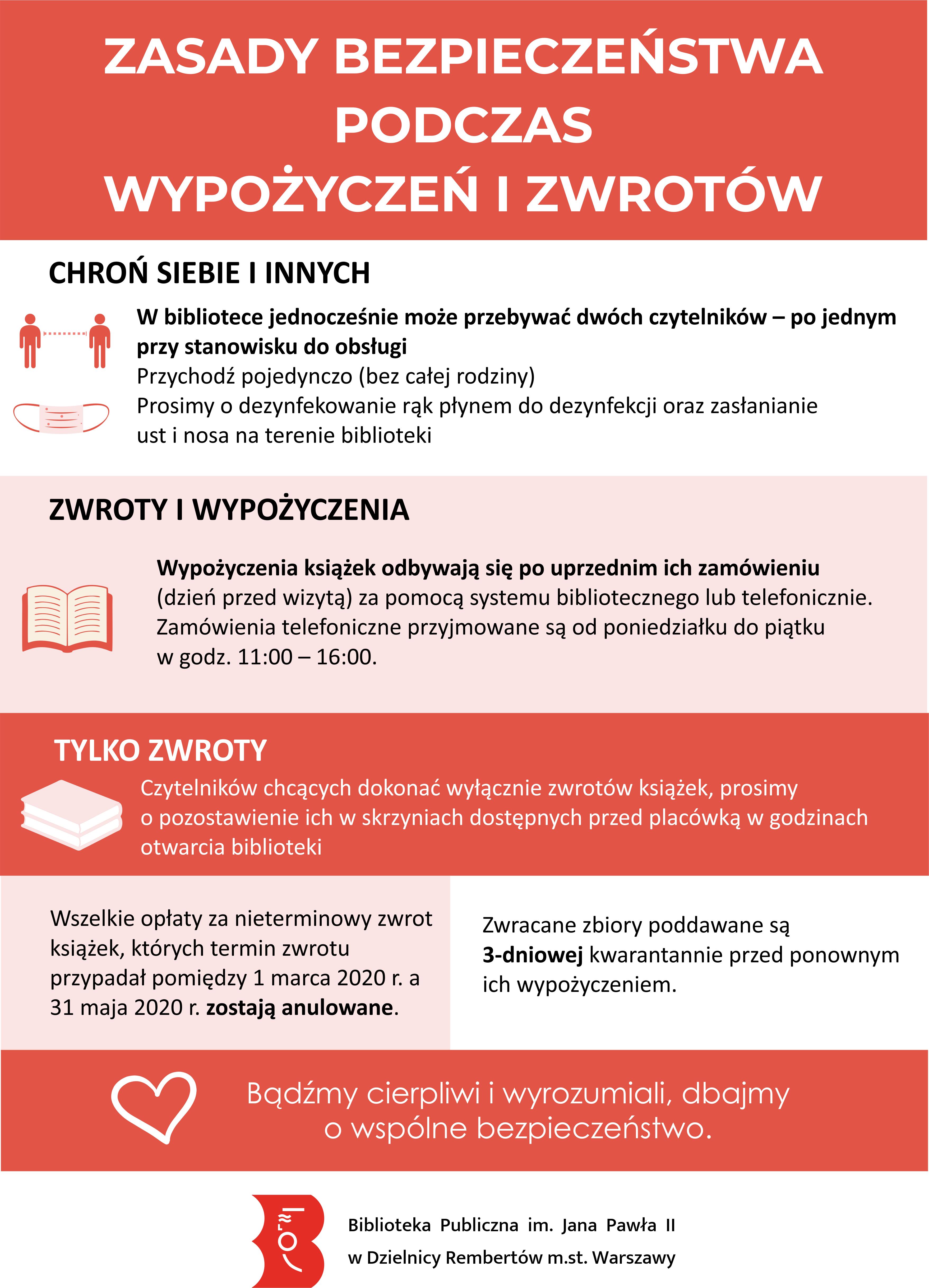 • wypożyczenia książek możliwe są po wcześniejszym ich zamówieniu (dzień przed wizytą w bibliotece) przez internet za pomocą systemu bibliotecznego lub telefonicznie (nie realizujemy zamówień złożonych przez e-maila lub messengera).