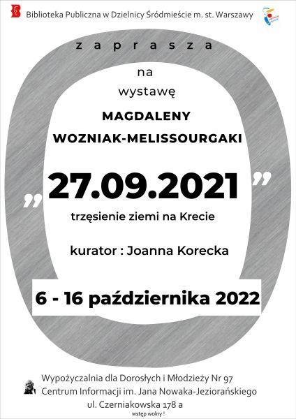 W dniach 6-16.10.2022 r. w Centrum Informacji im. Jana Nowaka-Jeziorańskiego przy ul. Czerniakowskiej 178a prezentowana będzie wystawa prac Magdaleny Wozniak-Melissourgaki. Wystawę pt.: „27.09.2021” trzęsienie ziemi na Krecie można oglądać od poniedziałku do piątku w godzinach 10:00-19:00.
