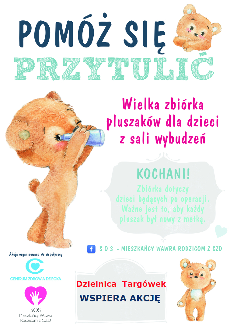 Biblioteka Publiczna w Dzielnicy Targówek m.st. Warszawy z wielką przyjemnością informuje o przystąpieniu do akcji „Pomóż się przytulić”, której celem jest zbiórka pluszaków dla dzieci z sali wybudzeń Centrum Zdrowia Dziecka.
