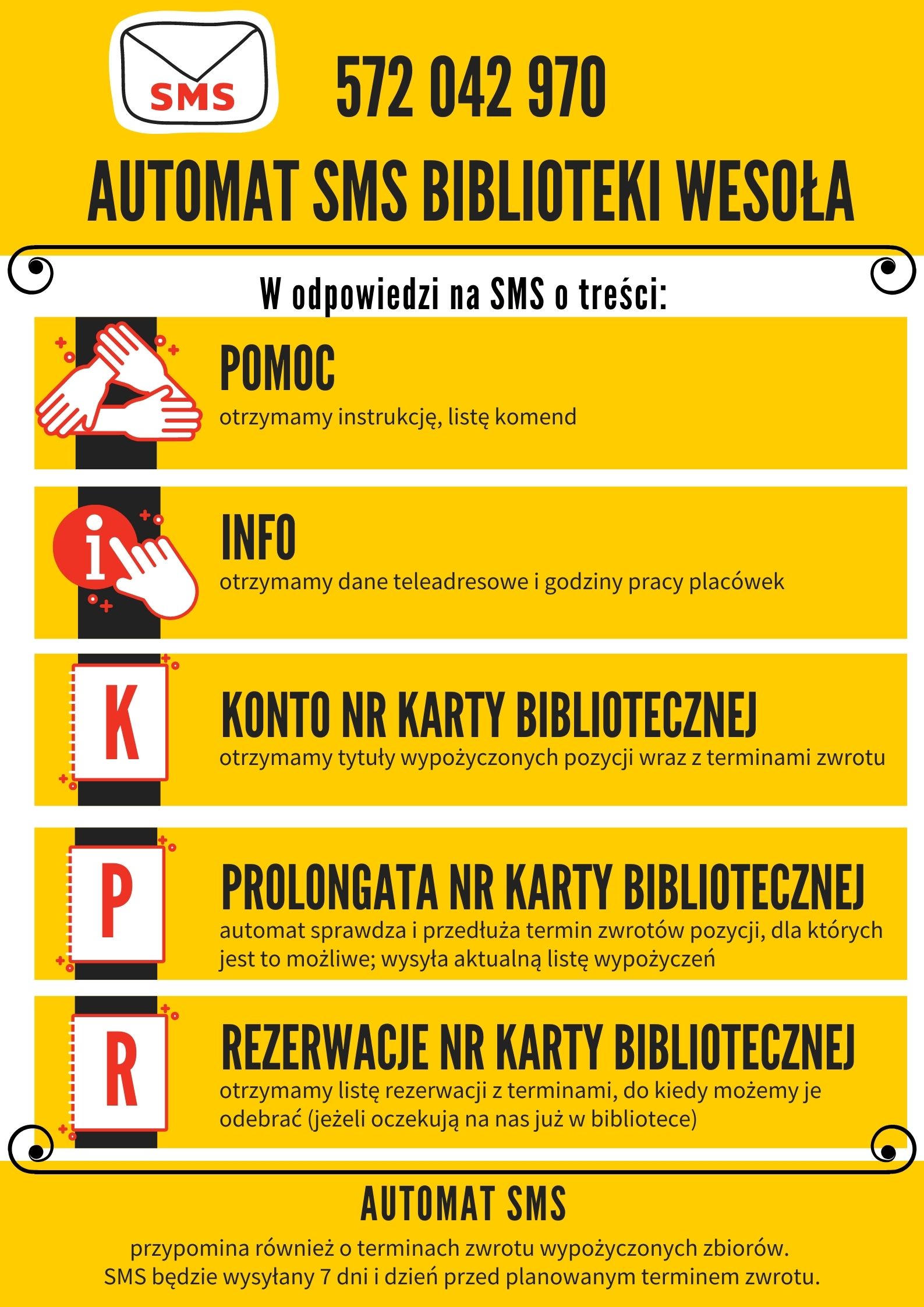 Biblioteka w Wesołej od 1.02.2021 r. uruchamia automat SMS-owy, który będzie przesyłał do Państwa informacje dotyczące m.in.: