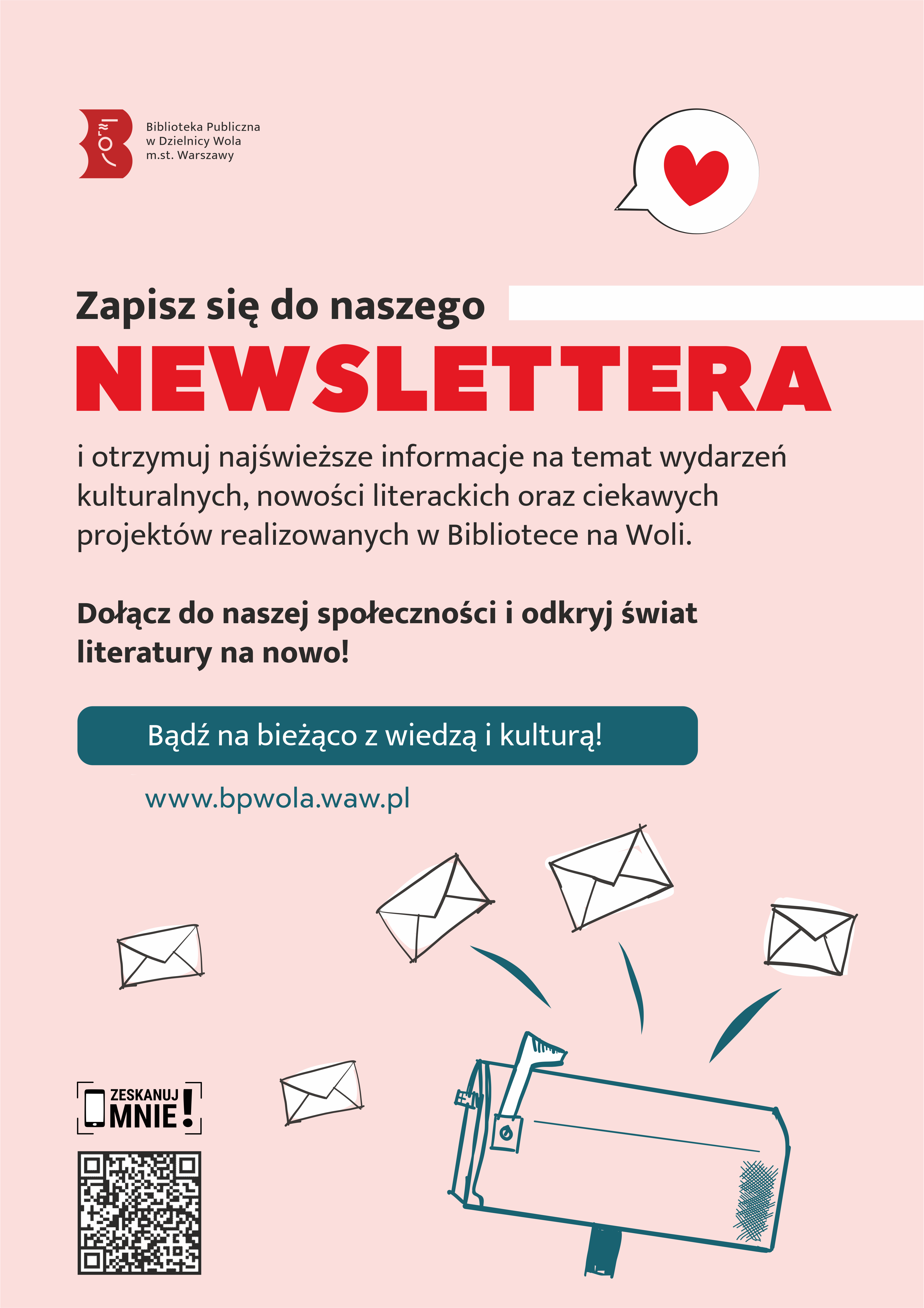 Zapisz się do newslettera i otrzymuj najświeższe informacje na temat wydarzeń kulturalnych, nowości literackich oraz ciekawych projektów realizowanych w Bibliotece na Woli.