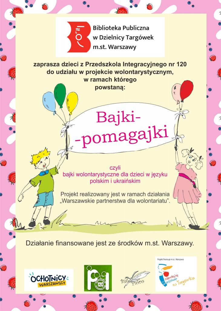 Projekt „Bajki-pomagajki, czyli bajki wolontarystyczne dla dzieci w języku ukraińskim i polskim” realizowany jest przez Bibliotekę Publiczną w Dzielnicy Targówek m.st. Warszawy w partnerstwie z Przedszkolem Integracyjnym nr 120.