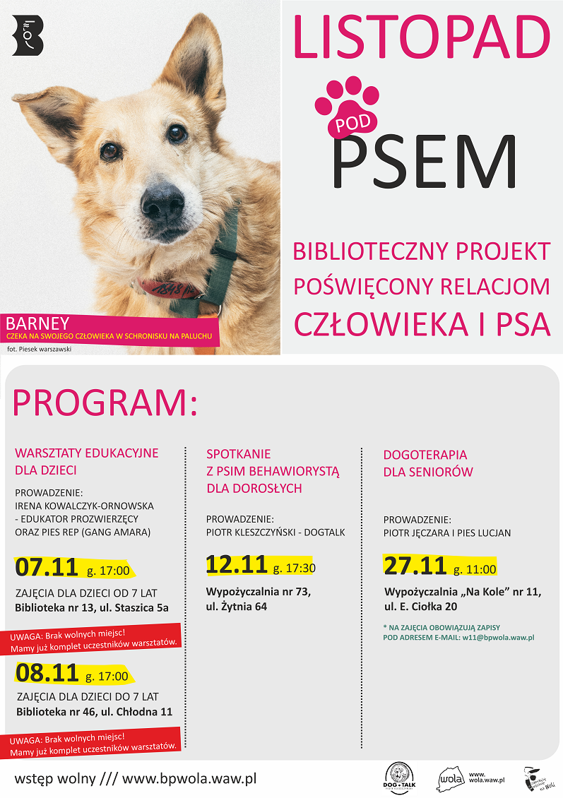 Listopad to miesiąc, który zazwyczaj kojarzy się ze złą pogodą i markotnymi nastrojami. Biblioteka na Woli postanowiła oswoić nas z jesienną, listopadową aurą i rozweselić ten czas dzięki kontaktom ze zwierzakami.