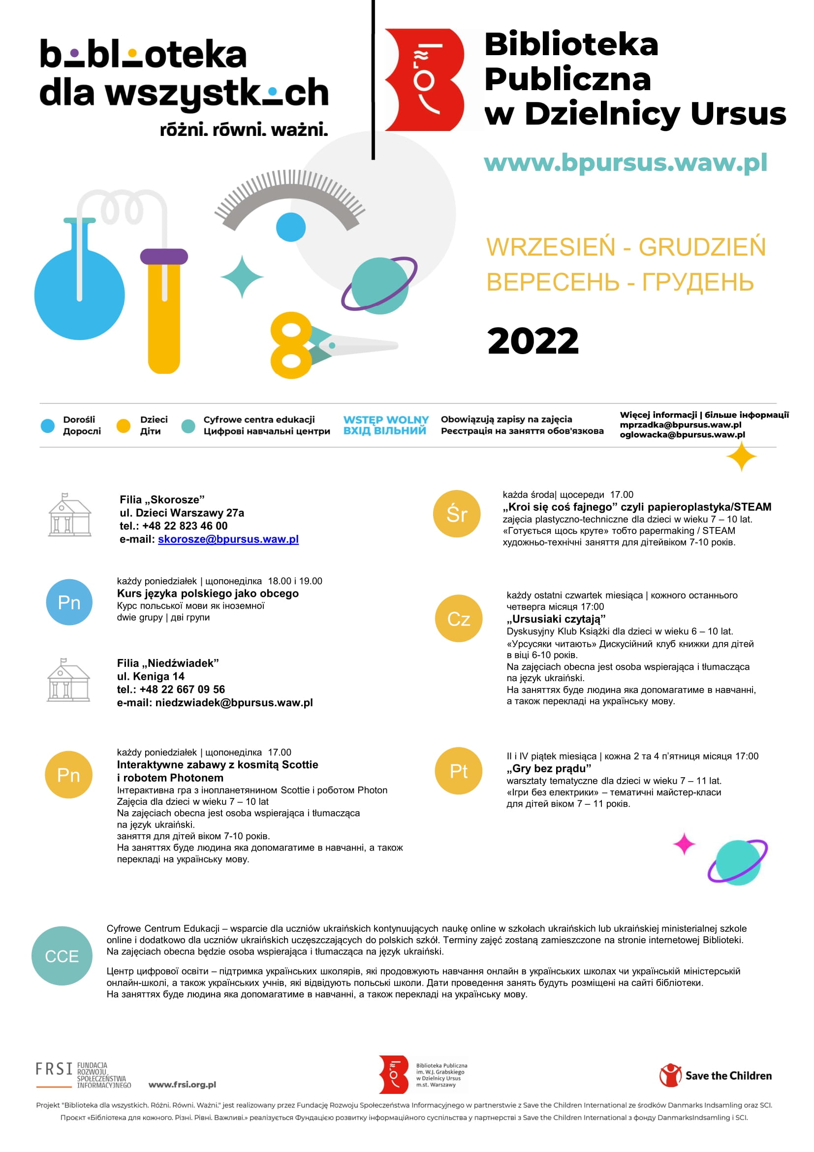 Cyfrowe Centrum Edukacji – wsparcie dla uczniów ukraińskich kontynuujących naukę online w szkołach ukraińskich lub ukraińskiej ministerialnej szkole online i dodatkowo dla uczniów ukraińskich uczęszczających do polskich szkół. Terminy zajęć zostaną zamieszczone na stronie internetowej Biblioteki. Na zajęciach obecna będzie osoba wspierająca i tłumacząca na język ukraiński.