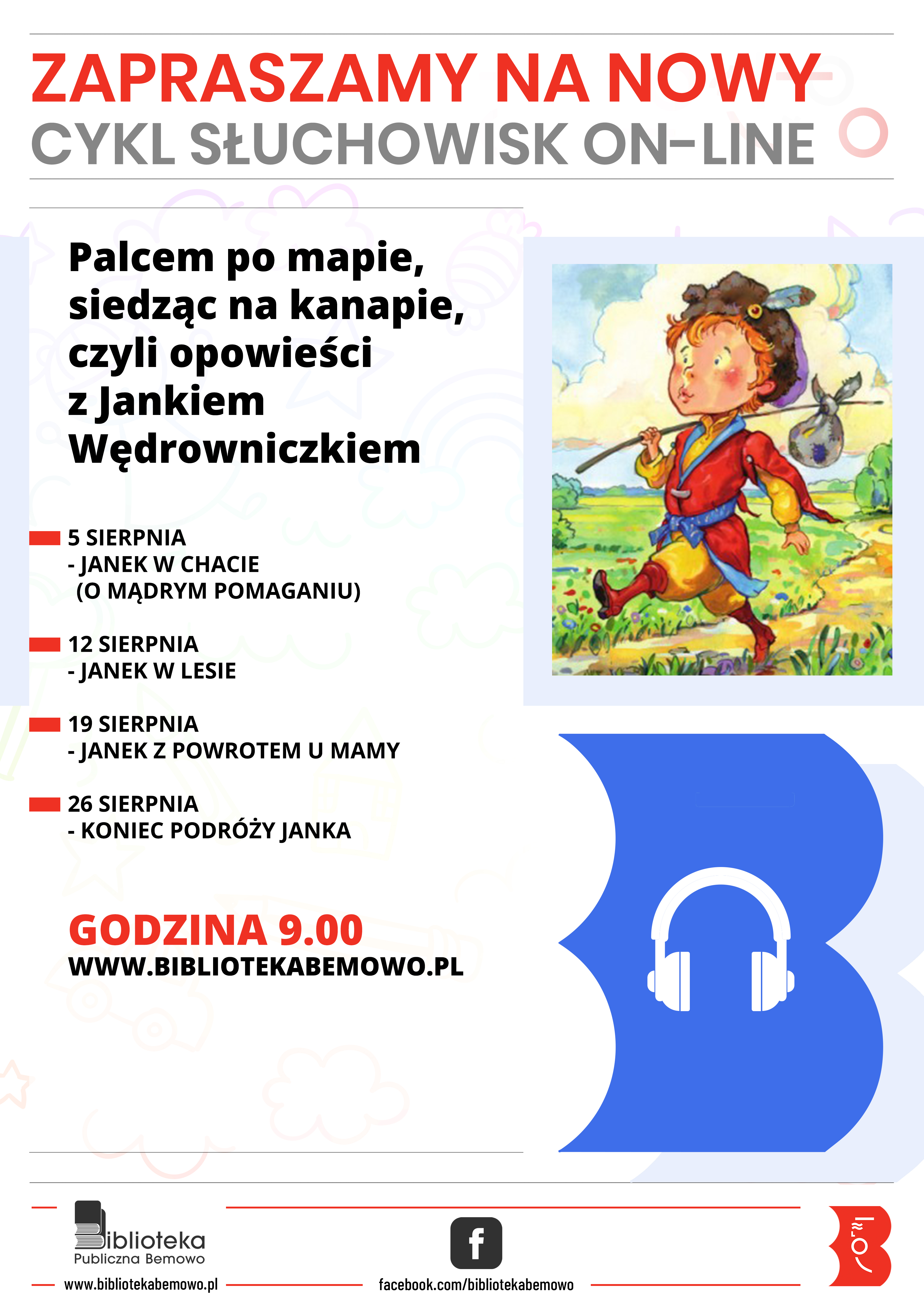 W każdą środę zapraszamy naszych młodych Czytelników na słuchowisko “Palcem po mapie, siedząc na kanapie, czyli opowieści z Jankiem Wędrowniczkiem”. Jankowi towarzyszyć będziemy w jego fascynujących wędrówkach i zobaczymy, co kryje się w powiedzeniu, że podróże kształcą – szczególnie, jeśli towarzyszy nam w nich książka.