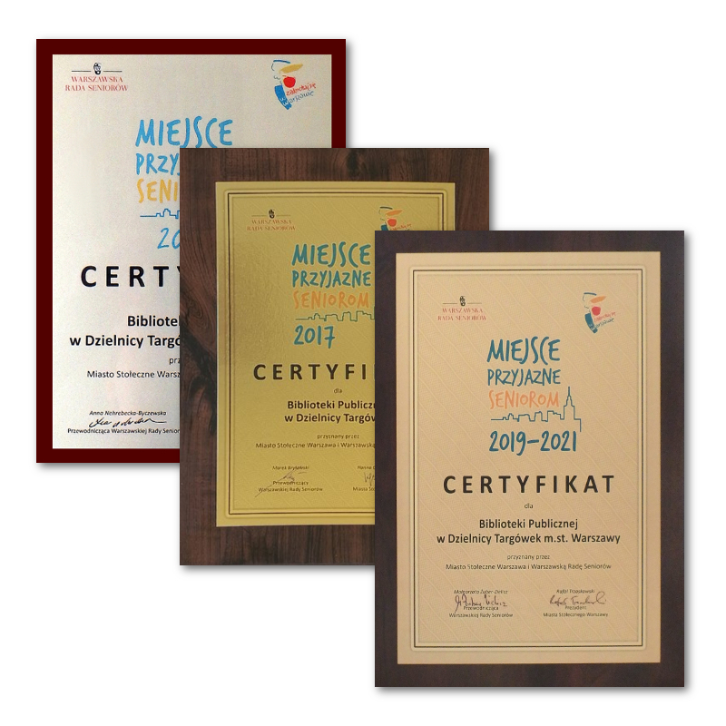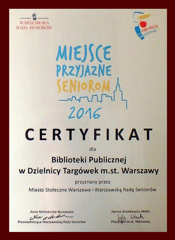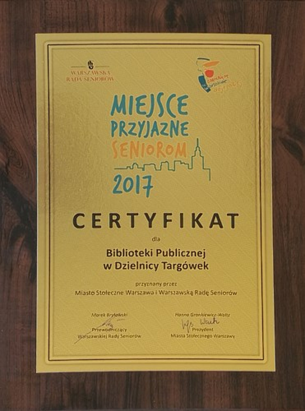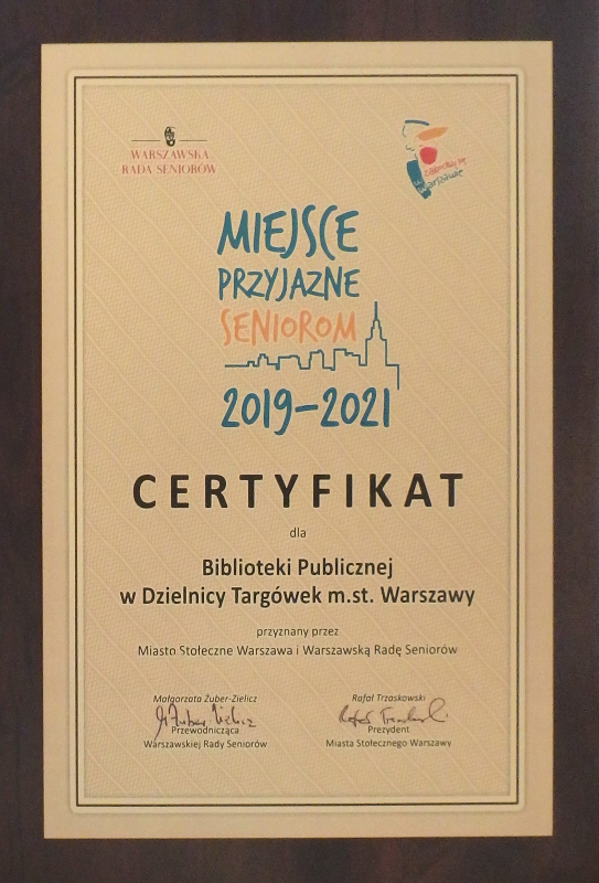 Z przyjemnością pragniemy poinformować, że Biblioteka Publiczna w Dzielnicy Targówek m.st. Warszawy otrzymała certyfikat „Miejsce Przyjazne Seniorom na lata 2019-2021” przyznany przez Miasto Stołeczne Warszawy i Warszawską Radę Seniorów.