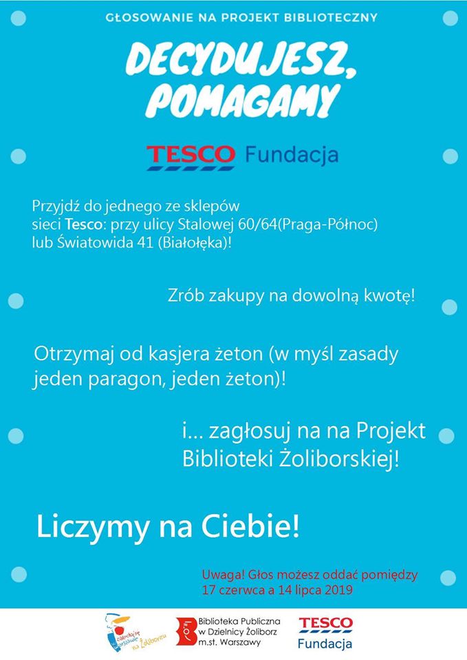 Biblioteka Publiczna w Dzielnicy Żoliborz m.st. Warszawy bierze udział w programie zainicjowanym przez Fundację Tesco „Decydujesz, pomagamy”.