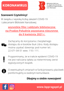 W związku z wysoką liczbą zachorowań COVID-19 i zaleceniami Biblioteki Narodowej, wszystkie filie Biblioteki Publicznej im. Zygmunta Jana Rumla w Dzielnicy Praga-Południe m.st. Warszawy, w tym Czytelnia Naukowa nr V, Wypożyczalnia Zbiorów Obcojęzycznych oraz Wypożyczalnia Książki Mówionej i Multimediów POZOSTANĄ ZAMKNIĘTE DLA CZYTELNIKÓW DO DNIA 9 KWIETNIA 2021 R.