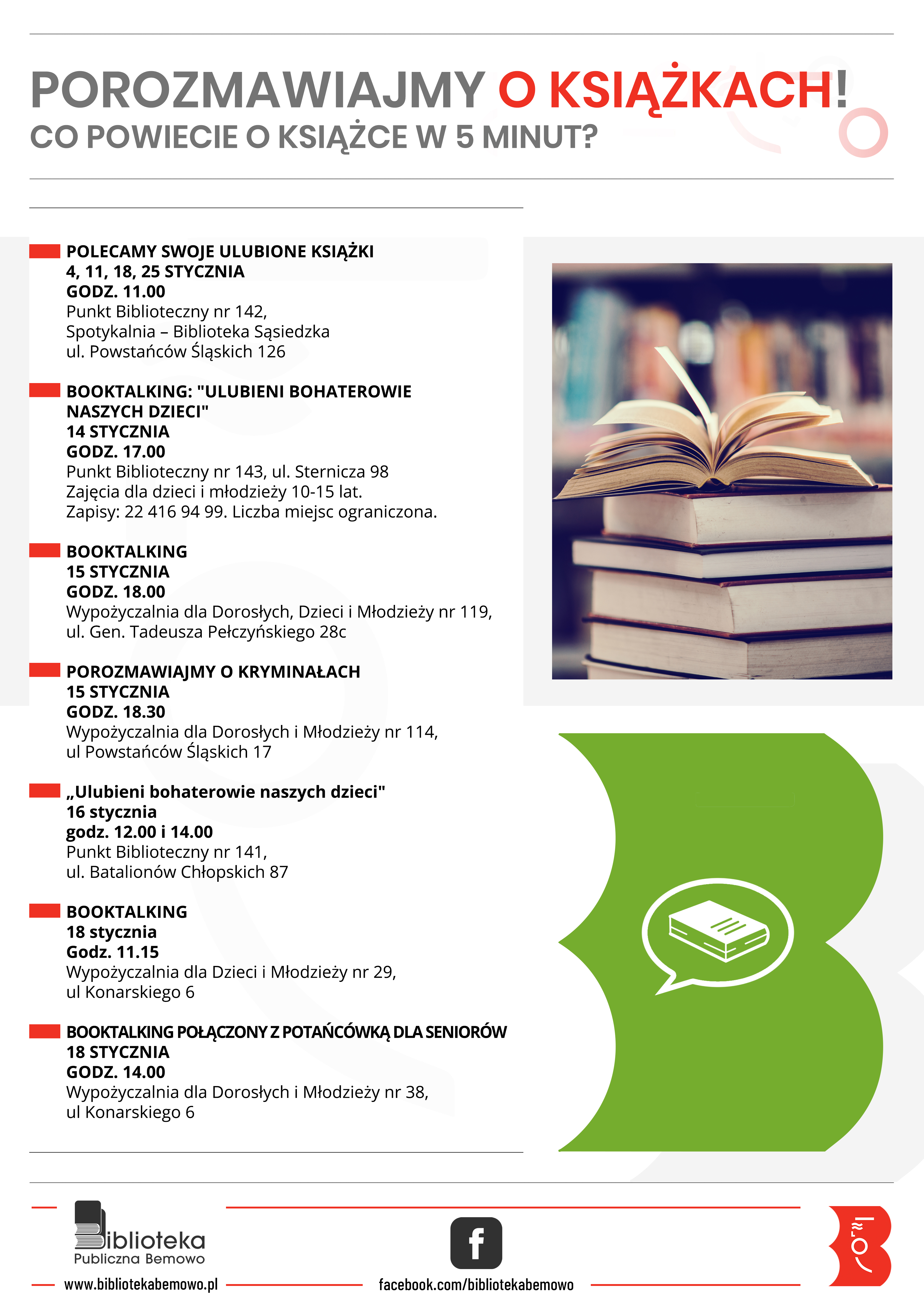 Booktalking, znalazł już swoje stałe miejsce wśród naszych wydarzeń. Tym razem zapraszamy na styczniowe spotkania, podczas których w ciągu 5 minut każdy będzie mógł opowiedzieć o swojej ulubionej książce. Propozycje ciekawej literatury przedstawią również nasi bibliotekarze. Zapraszamy!