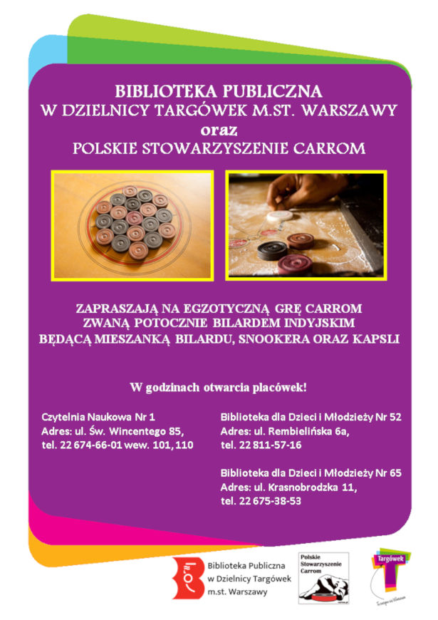 Biblioteka Publiczna w Dzielnicy Targówek m. st. Warszawy oraz Polskie Stowarzyszenie Carrom zapraszają na egzotyczną grę carrom zwaną potocznie bilardem indyjskim.