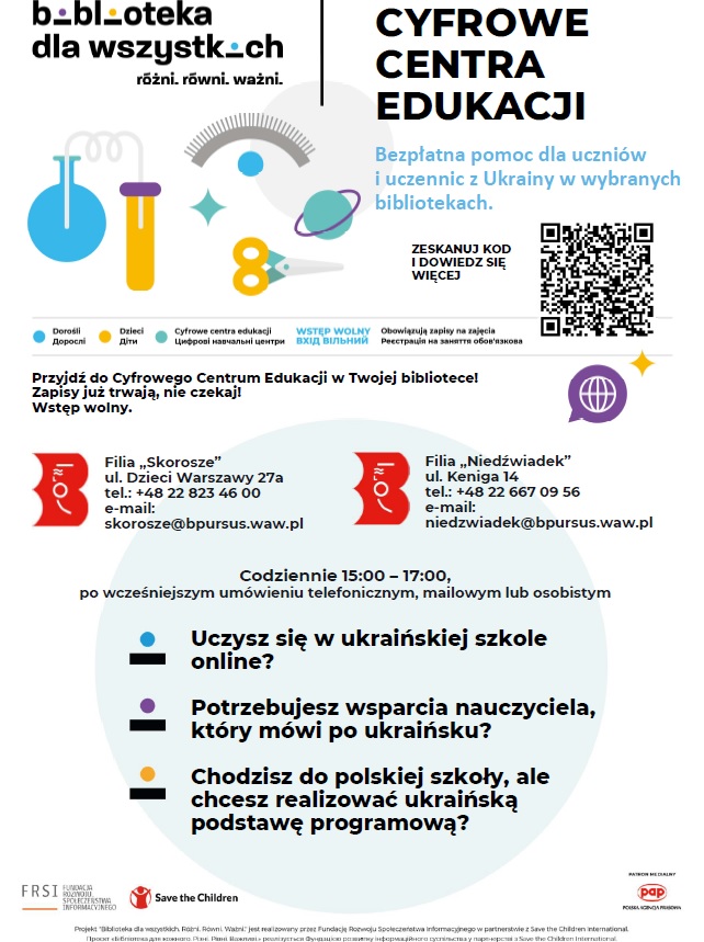 Od września 2022 r. w Bibliotece Publicznej im. W. J. Grabskiego dzielnicy Ursus m.st. Warszawy działa Cyfrowe Centrum Edukacji. Jest to wsparcie dla uczniów ukraińskich kontynuujących naukę online w szkołach ukraińskich lub ukraińskiej ministerialnej szkole online. Do nauki w Centrum zapraszamy także uczniów ukraińskich uczęszczających do szkół polskich. Wszystkim chętnym uczniom zapewniamy wsparcie osoby obeznanej z ukraińskim systemem edukacji, znającej język polski i ukraiński.