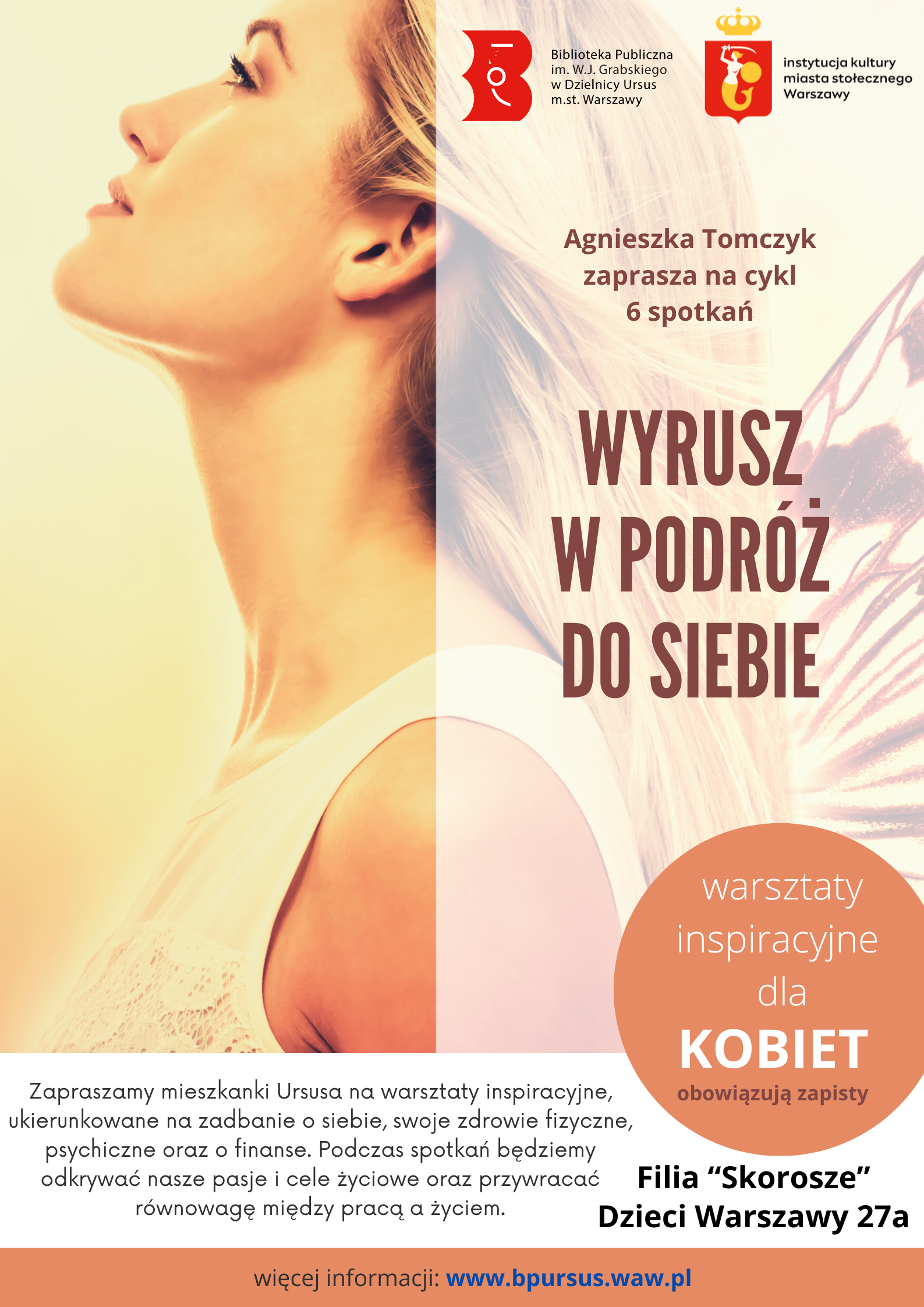 Od lutego do czerwca 2024 r. Filia „Skorosze” zaprasza mieszkanki Ursusa na cykl 6 spotkań inspiracyjnych dla kobiet pt. Wyrusz w podróż do Siebie wraz z dodatkowo zachęcającym apelem Odwaga zmiany zaczyna się tutaj.