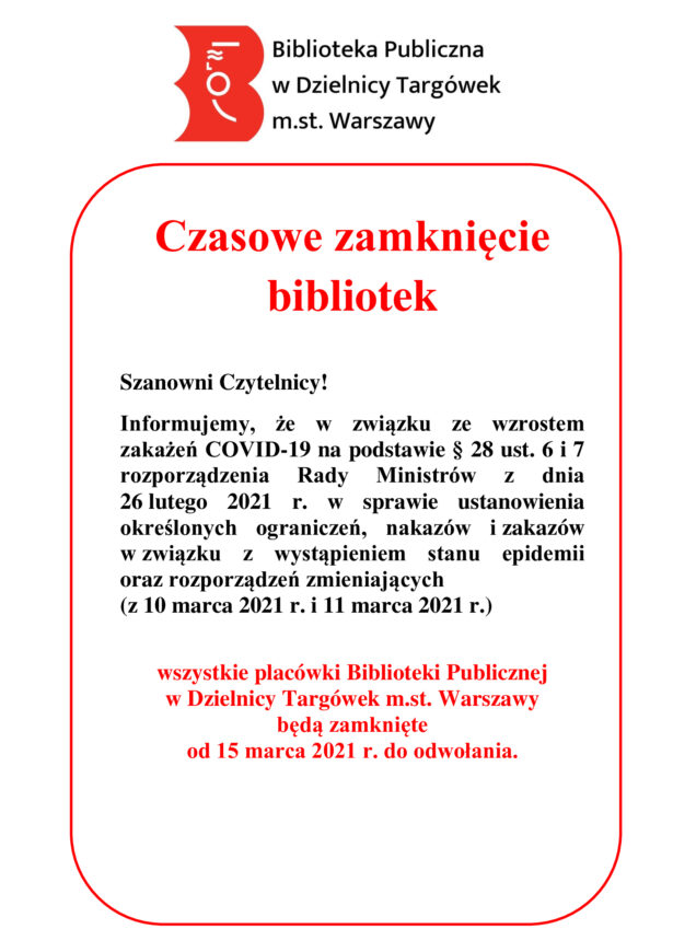 Komunikat o czasowym zamknięciu wszystkich filii Biblioteki Publicznej w Dzielnicy Targówek m.st. Warszawy