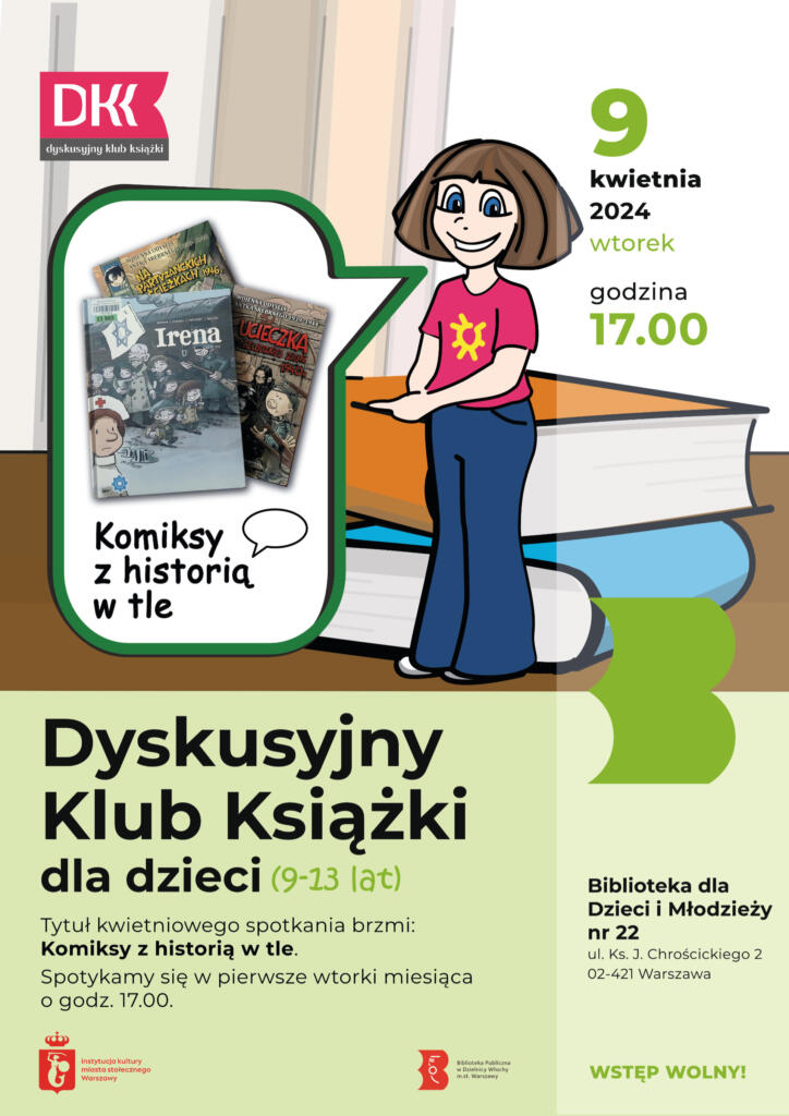 We wtorek 9 kwietnia 2024 o godz. 17.00 zapraszamy dzieci lubiące czytać do Biblioteki dla Dzieci i Młodzieży nr 22 na spotkanie Dyskusyjnego Klubu Książek dla dzieci (9-13 lat).