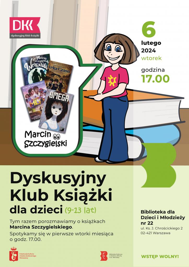 We wtorek 6 lutego 2024 o godz. 17.00 zapraszamy dzieci lubiące czytać do Biblioteki dla Dzieci i Młodzieży nr 22 na spotkanie Dyskusyjnego Klubu Książek dla dzieci (9-13 lat).