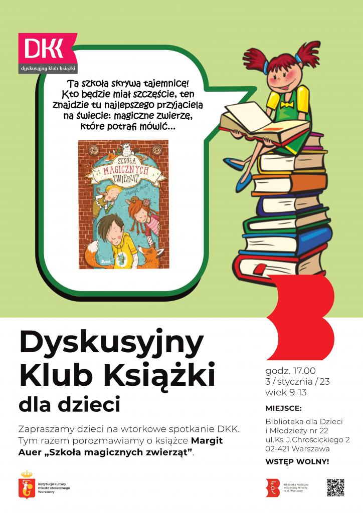 Zapraszamy dzieci 3 stycznia 2023 o godz. 17.00 do Biblioteki dla Dzieci i Młodzieży nr 22 na wtorkowe spotkanie Dyskusyjnego Klubu Książki dla dzieci. Tym razem porozmawiamy o książce Margit Auer „Szkoła magicznych zwierząt”. Wstęp wolny!
