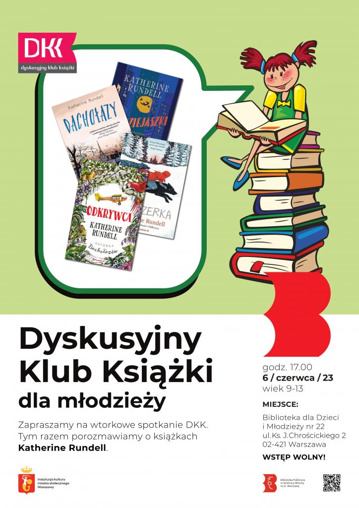 We wtorek 6 czerwca 2023 o godz. 17.00 Biblioteka dla Dzieci i Młodzieży nr 22 zaprasza na spotkanie Dyskusyjnego Klubu Książki dla młodzieży. Tym razem porozmawiamy o książkach Katherine Rundell („Dachołazy”, „Odkrywca”, Wilczerka” i „Złodziejaszki”).