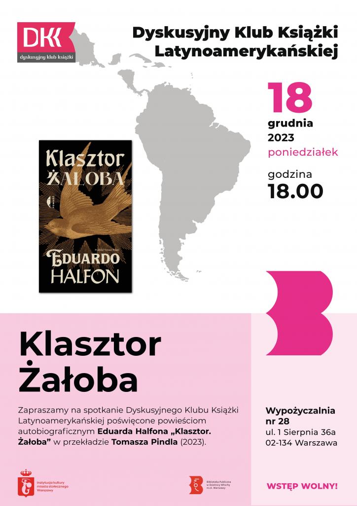W poniedziałek 18 grudnia 2023 o godz. 18.00 Wypożyczalnia nr 28 zaprasza miłośników kultury latynoamerykańskiej na spotkanie Dyskusyjnego Klubu Książki Latynoamerykańskiej poświęcone powieściom autobiograficznym Eduarda Halfona: „Klasztor. Żałoba” w przekładzie Tomasza Pindla.
