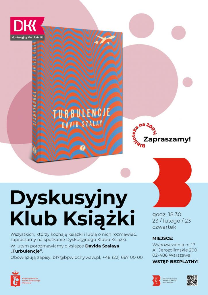 W czwartek 23 lutego 2023 o godz. 18.30 Wypożyczalnia nr 17 zaprasza wszystkich, którzy kochają książki i lubią o nich rozmawiać, na spotkanie Dyskusyjnego Klubu Książki poświęcone książce Davida Szalaya „Turbulencje”. Wstęp bezpłatny.
