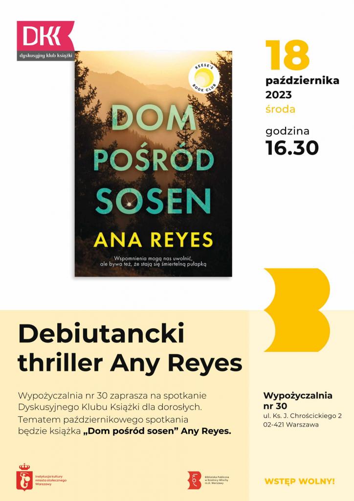 W środę 18 października 2023 o godz. 16.30 Wypożyczalnia nr 30 zaprasza na spotkanie Dyskusyjnego Klubu Książki poświęcone książce Any Reyes „Dom pośród sosen”.