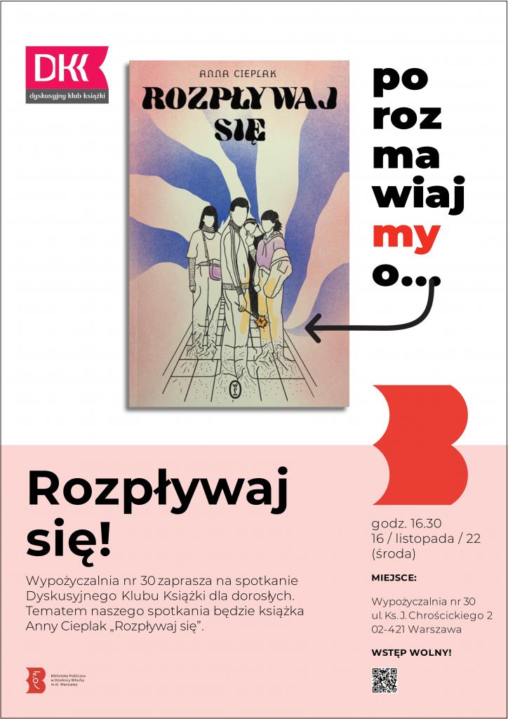 Wypożyczalnia nr 30 zaprasza 16 listopada 2022 roku o godz. 16.30 na spotkanie Dyskusyjnego Klubu Książki dla dorosłych. Tematem naszego spotkania będzie książka Anny Cieplak „Rozpływaj się”.