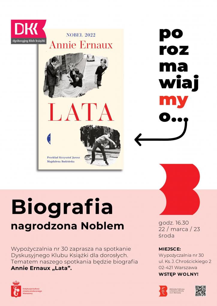 W środę 22 marca 2023 o godz. 16.30 Wypożyczalnia nr 30 zaprasza na spotkanie Dyskusyjnego Klubu Książki poświęcone biografii Annie Ernaux „Lata”. Wstęp wolny.