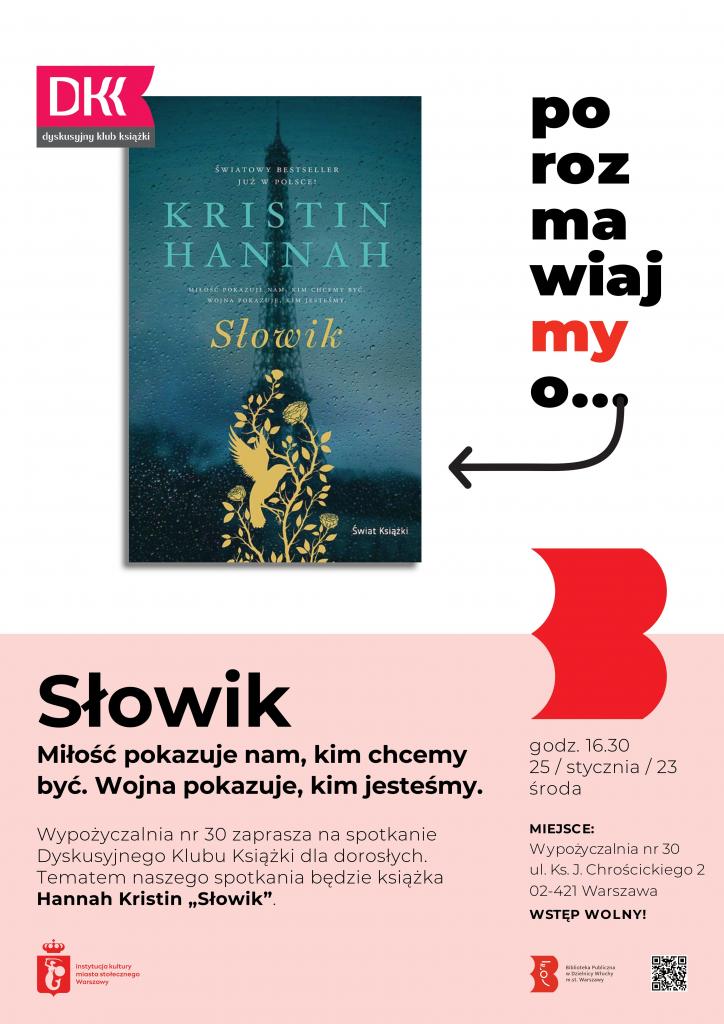 Zapraszamy w środę 25 stycznia 2023 o godz. 16.30 do Wypożyczalni nr 30 na spotkanie Dyskusyjnego Klubu Książki poświęcone książce Hannah Kristin „Słowik”. Wstęp wolny.