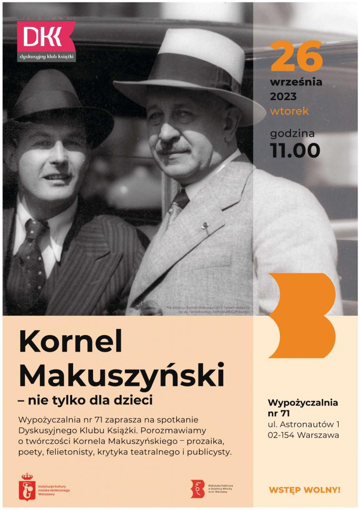 We wtorek 26 września 2023 o godz. 11.00 Wypożyczalnia nr 71 zaprasza na spotkanie Dyskusyjnego Klubu Książki. Porozmawiamy o twórczości Kornela Makuszyńskiego – prozaika, poety, felietonisty, krytyka teatralnego i publicysty.