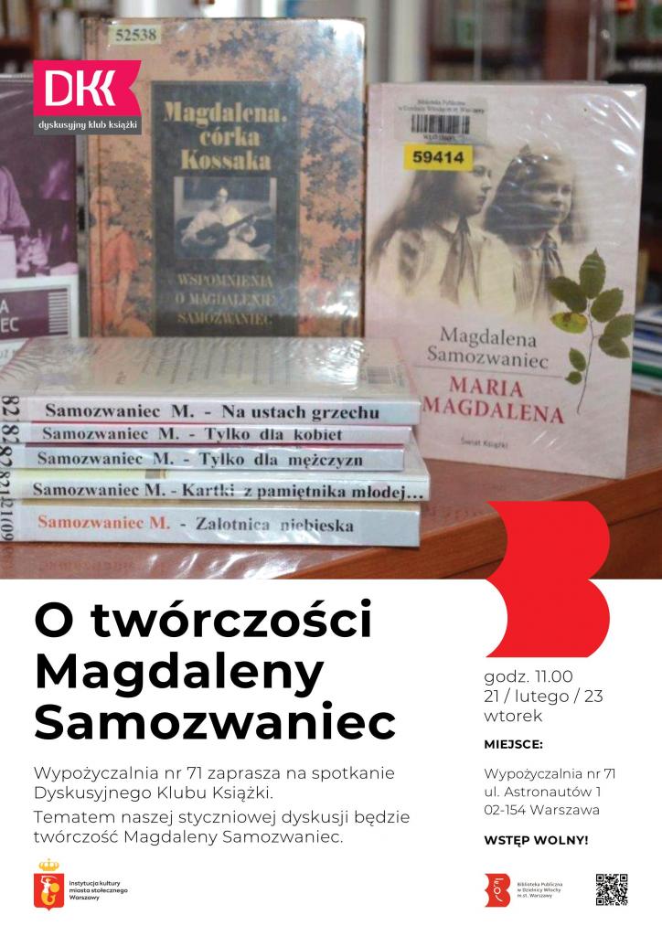 We wtorek 21 lutego 2023 o godz. 11.00 Wypożyczalnia nr 71 zaprasza na spotkanie Dyskusyjnego Klubu Książki poświęcone twórczości Magdaleny Samozwaniec. Wstęp wolny.