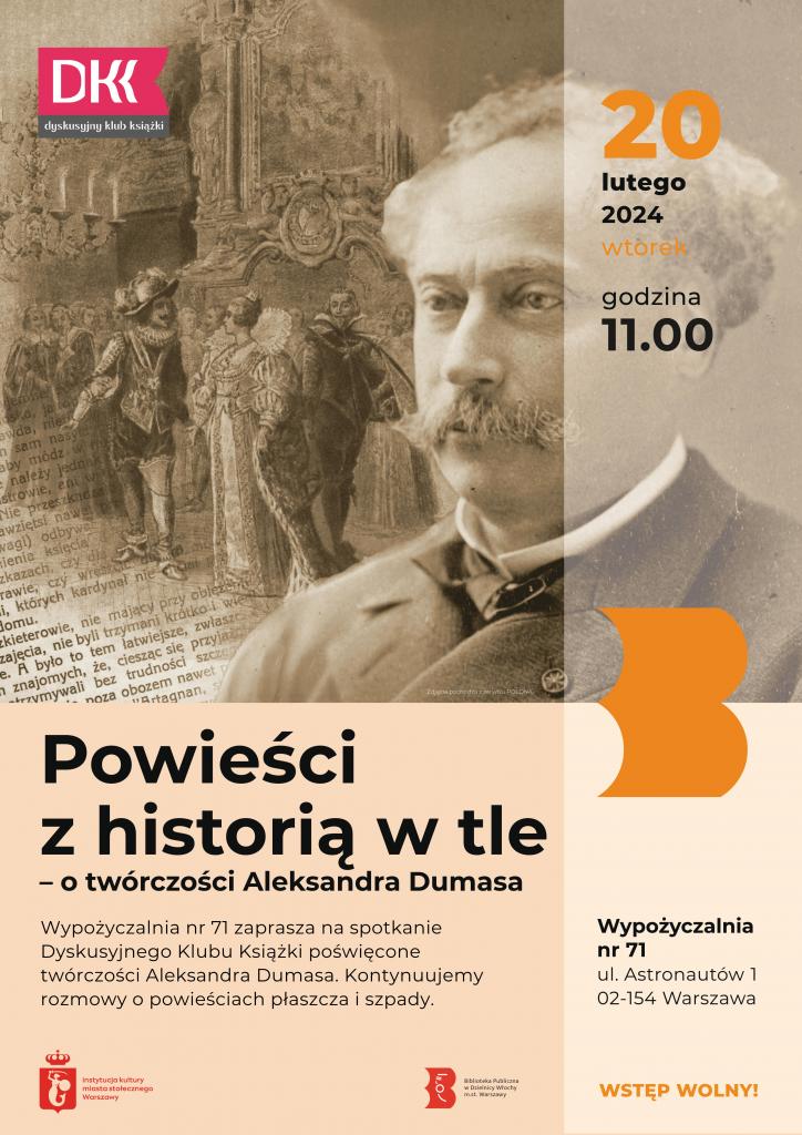We wtorek 20 lutego 2024 o godz. 11.00 Wypożyczalnia nr 71 zaprasza na spotkanie Dyskusyjnego Klubu Książki pt. Powieści z historią w tle – o twórczości Aleksandra Dumasa. Będzie to kontynuacja naszych styczniowych rozmów.