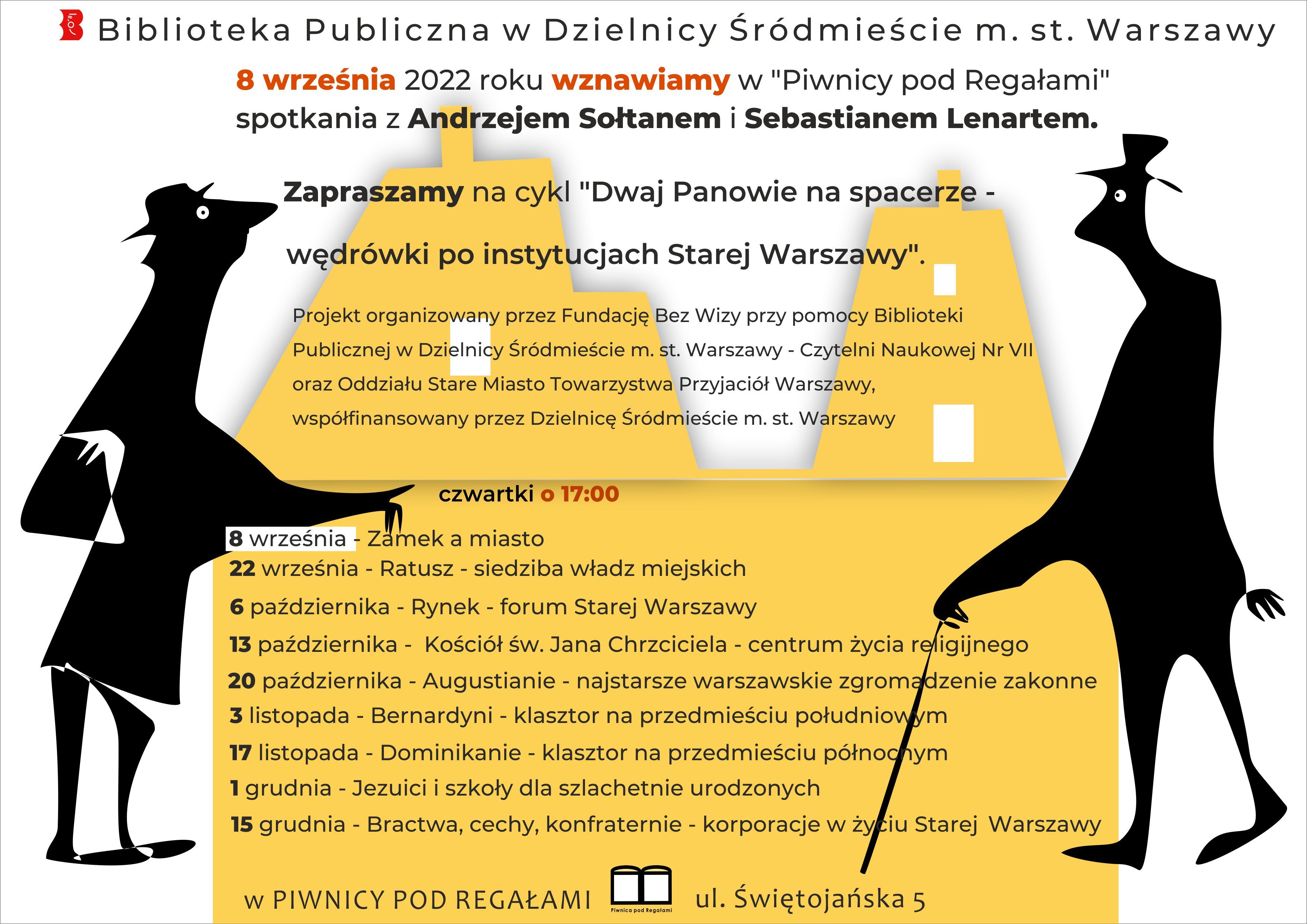 8 września 2022 roku wznawiamy w „Piwnicy pod Regałami” spotkania z Andrzejem Sołtanem i Sebastianem Lenartem. Zarówno bywalców jak i nowych słuchaczy zapraszamy, tym razem na cykl „Dwaj Panowie na spacerze – wędrówki po instytucjach Starej Warszawy”. Formuła, w której pozostając w komfortowym zaciszu „Piwnicy pod Regałami” odwiedzimy szereg miejsc wydaje się godna polecenia. Projekt organizowany przez Fundację Bez Wizy przy pomocy Biblioteki Publicznej w Dzielnicy Śródmieście m.st. Warszawy – Czytelnia Naukowa Nr VII oraz Oddziału Stare Miasto Towarzystwa Przyjaciół Warszawy współfinansowany przez Dzielnicę Śródmieście m.st. Warszawy.