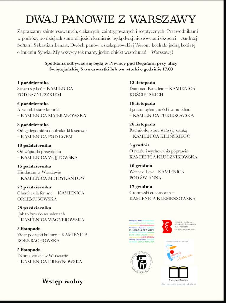 Biblioteka Publiczna w Dzielnicy Śródmieście m.st. Warszawy zaprasza do „Piwnicy pod Regałami” przy ul. Świętojańskiej 5 na cykl spotkań poświęcony kamienicom Starego Miasta w Warszawie.