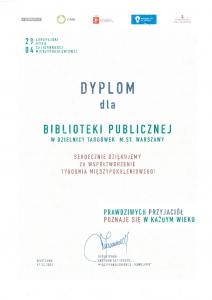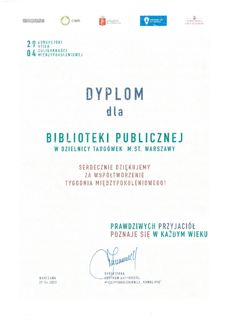 Serdecznie dziękujemy Centrum Aktywności Międzypokoleniowej „Nowolipie” za dyplom. Bardzo się cieszymy, że po raz kolejny wzięliśmy udział w Tygodniu Międzypokoleniowym i… już zbieramy pomysły na przyszłoroczne wydarzenia!