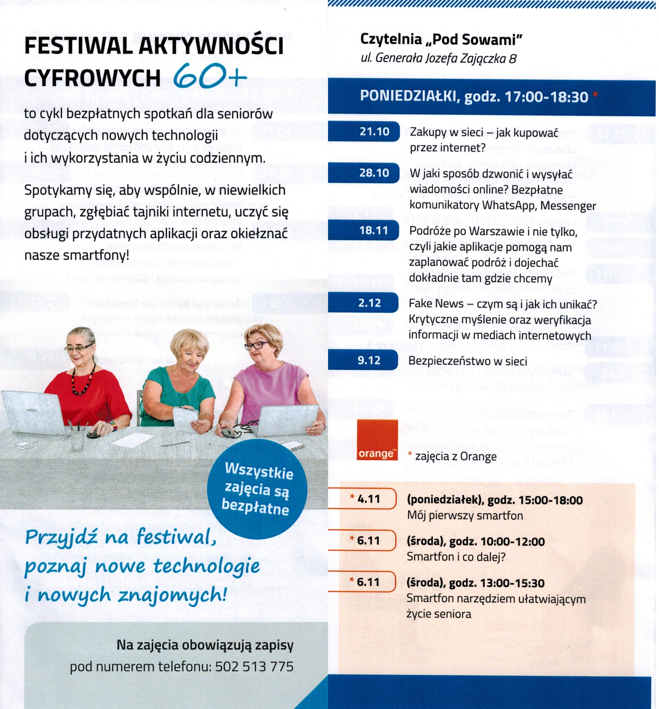 Biblioteka Publiczna Dzielnicy Żoliborz m.st. Warszawy oraz Fundacja Zaczyn, zapraszają na cykl bezpłatnych zajęć dla seniorów, poświęconych nowym technologiom i ich wykorzystaniu w życiu codziennym pod nazwą „Festiwal Aktywności Cyfrowych 60+”. Pod okiem instruktora seniorzy spotykają się, aby wspólnie, w niewielkich grupach, zgłębiać tajniki internetu, uczyć się obsługi przydatnych aplikacji oraz dowiedzieć się o efektywnym wykorzystaniu smartfona.