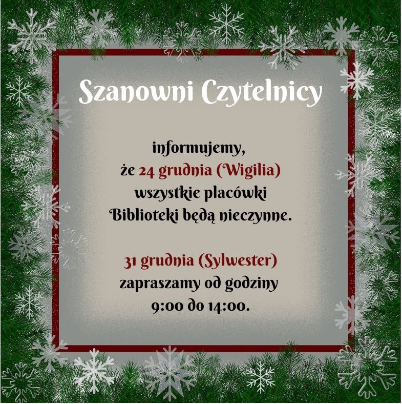 Informujemy, że 24 grudnia (Wigilia) wszystkie placówki Biblioteczne będą nieczynne.