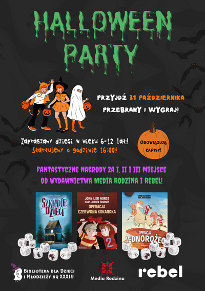 31 października zapraszamy na HALLOWEEN PARTY 🎃 Przyjdź przebrany i wygraj fantastyczne nagrody za I, II, III miejsce od Wydawnictwa Media Rodzina oraz Rebel. Zapraszamy dzieci w wieku 6-12 lat! Chociaż oficjalnie startujemy o godzinie 16:00, zapraszamy młodych czytelników na gry i zabawy już od 14:00 🦉