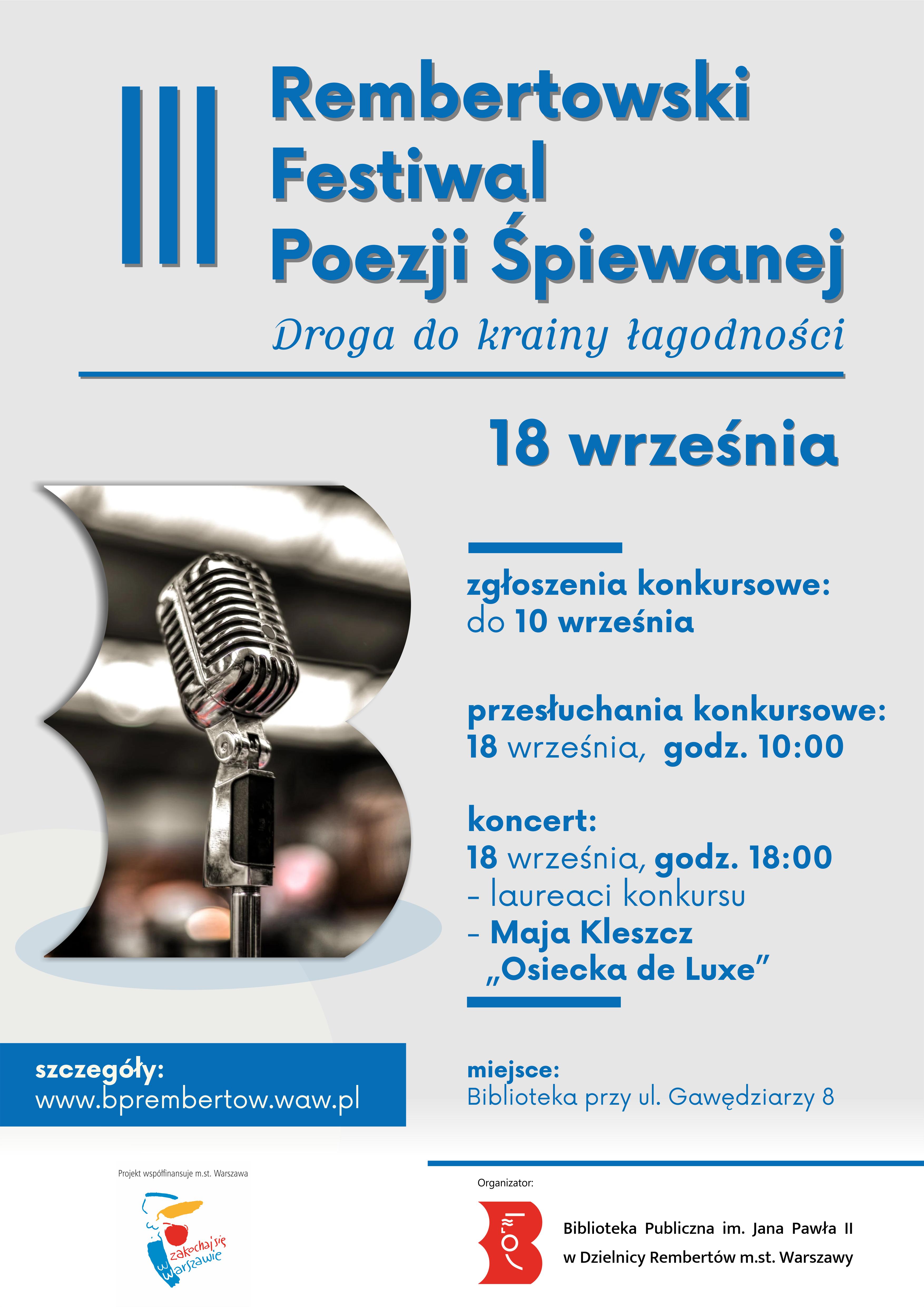 Po rocznej przerwie w rembertowskiej bibliotece odbędzie się wydarzenie, które ma na celu promocję poezji śpiewanej, łączącej piękno słowa i dźwięków. Wykonawcy – amatorzy będą mieli okazję do zaprezentowania swojego talentu przed jury. Najlepsi nie tylko otrzymają statuetki i nagrodę w postaci indywidualnych konsultacji wokalnych, ale również wystąpią podczas koncertu finałowego tuż przed gwiazdą wieczoru – Mają Kleszcz!