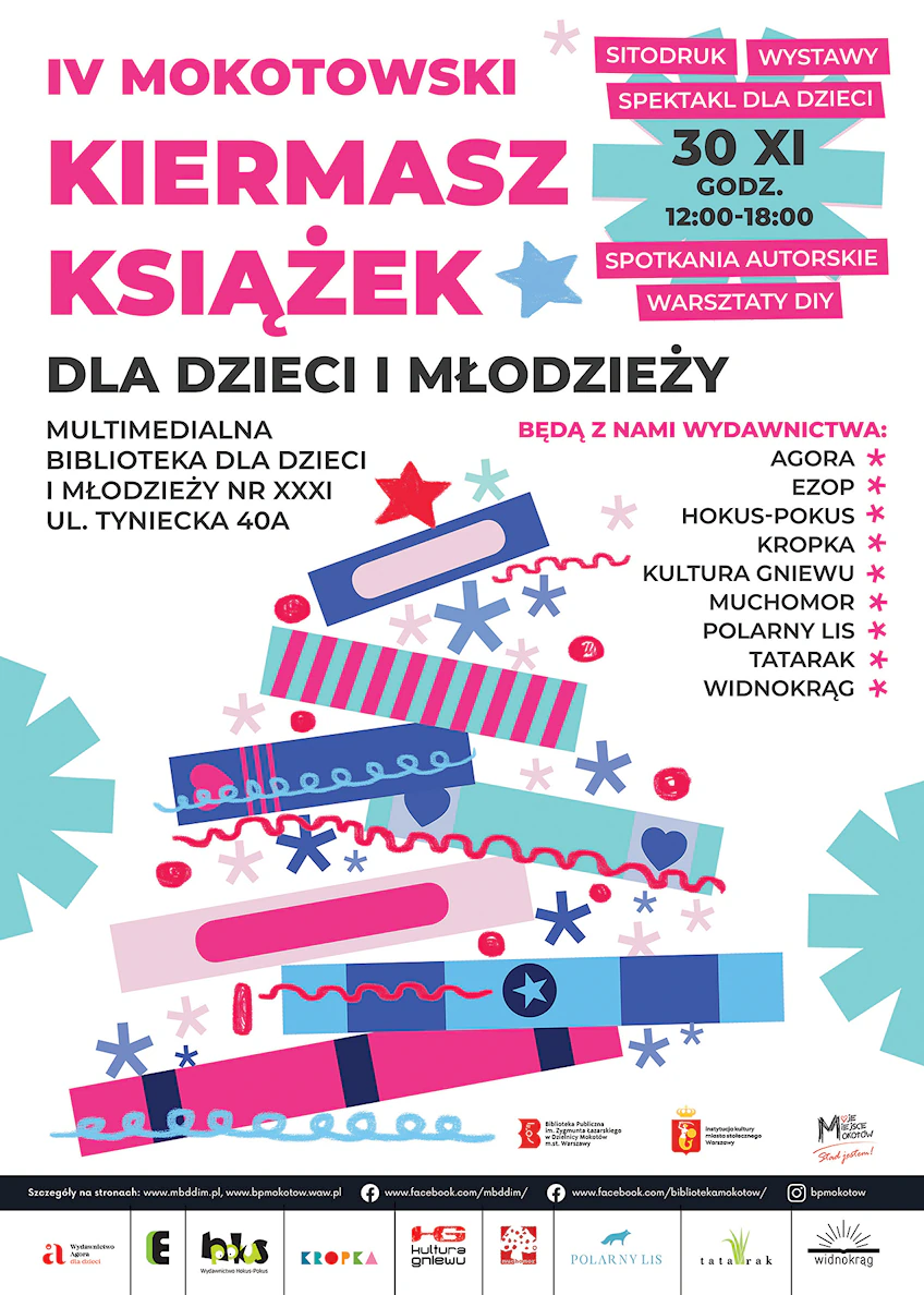 Biblioteka Mokotów zaprasza na IV edycję Mokotowskiego Kiermaszu Książek dla Dzieci i Młodzieży. To znakomita okazja, by wprost od wydawców kupić ich najnowsze propozycje. Będą z nami: Wydawnictwo Agora Dzieciom, Druga Noga, Ezop, Hokus-Pokus, Kropka, Kultura Gniewu, Muchomor, Polarny Lis, Tatarak, Widnokrąg, Wytwórnia.