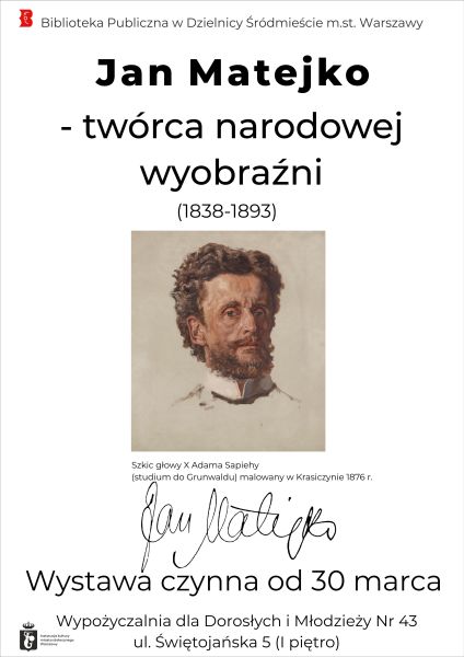 W roku Jana Matejki (w 185 rocznicę urodzin i 130 rocznicę śmierci malarza) zapraszamy naszych czytelników i wszystkich miłośników malarstwa autora Bitwy pod Grunwaldem do Wypożyczalni nr 43 przy ul. Świętojańskiej 5.