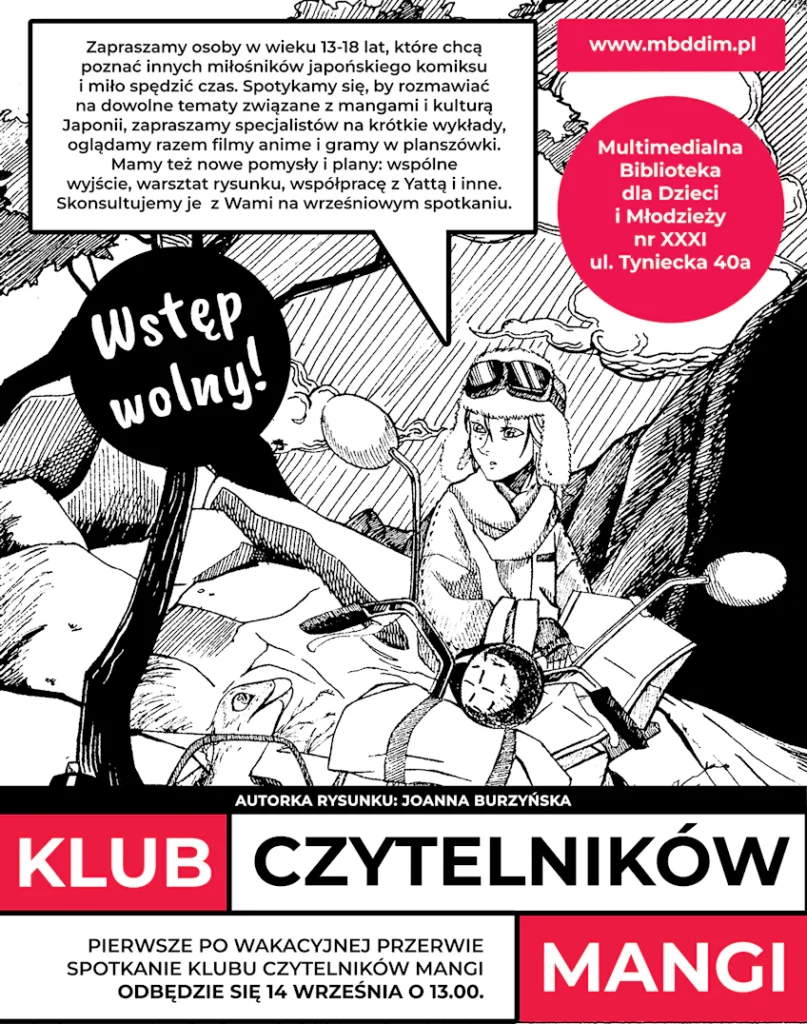 Pierwsze po wakacyjnej przerwie spotkanie Klubu Czytelników Mangi w Multimedialnej Bibliotece nr XXXI odbędzie się 14 września o 13:00.