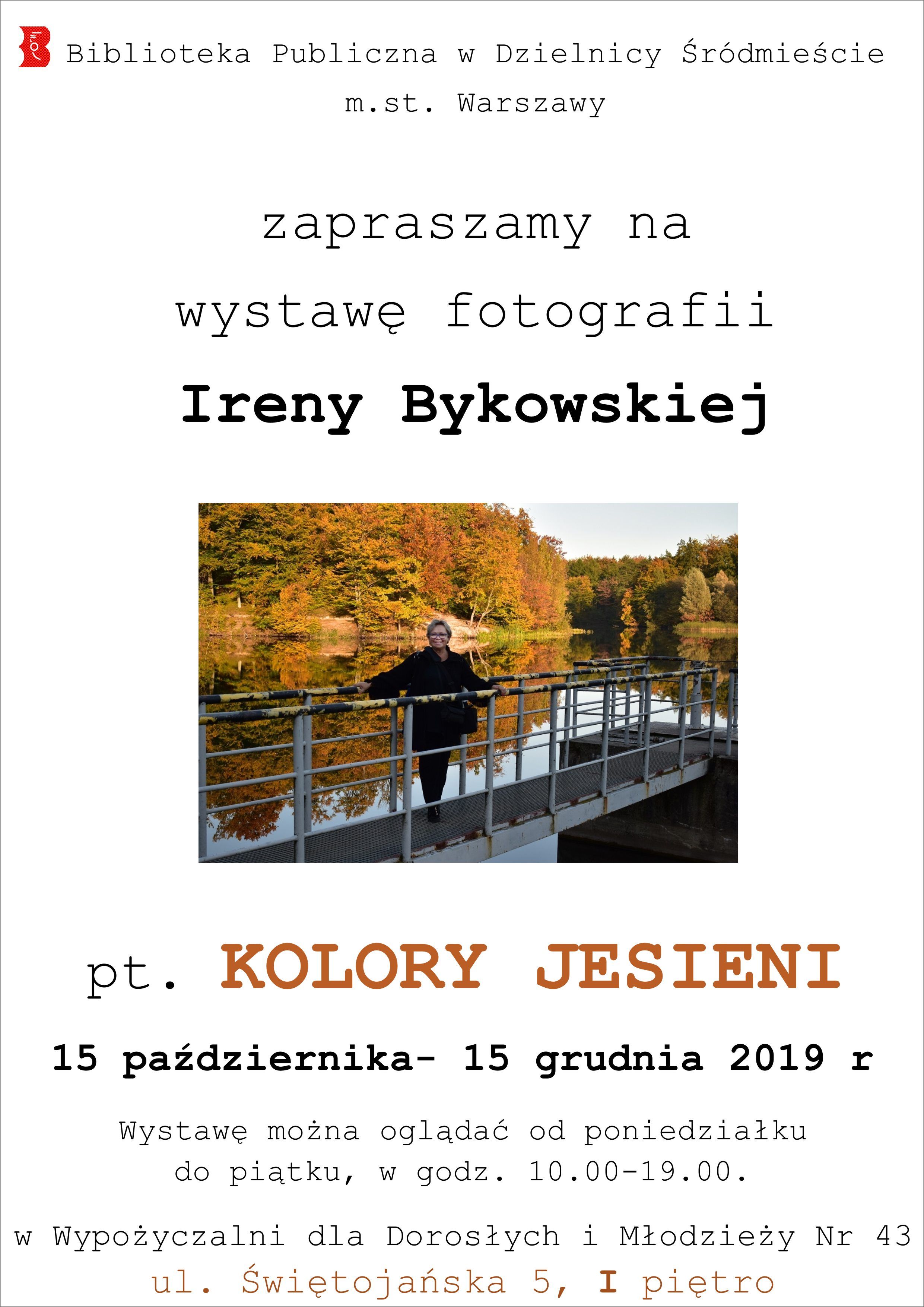 Biblioteka Publiczna w Dzielnicy Śródmieście m.st. Warszawy zaprasza do Wypożyczalni dla Dorosłych i Młodzieży nr 43 przy ulicy Świętojańskiej 5 na wystawę fotografii Ireny Bykowskiej pt. „Kolory jesieni”.