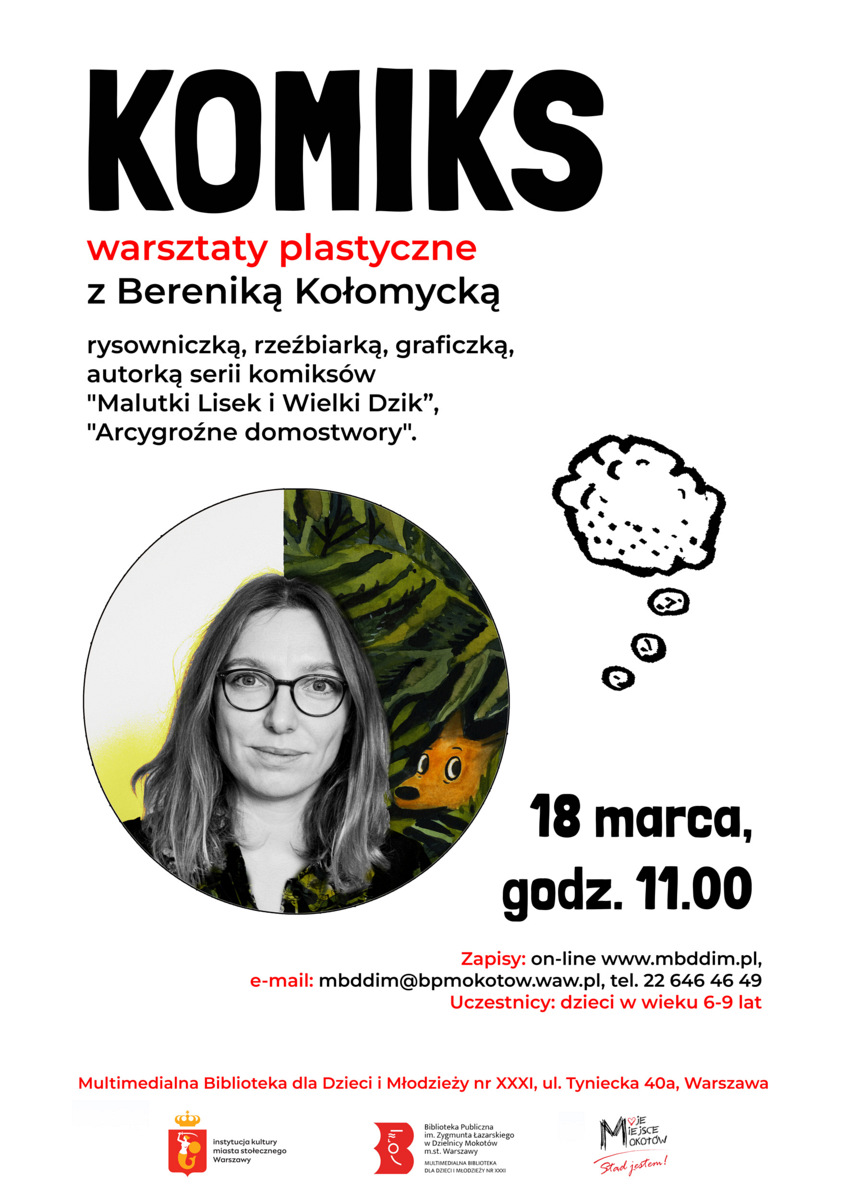 Lubicie pięknie namalowane i świetnie napisane komiksy? Czy znacie serię „Malutki Lisek i Wielki Dzik” i „Arcygroźne domostwory”? Zapraszamy dzieci w wieku 6-9 lat na warsztaty plastyczne z Bereniką Kołomycką, autorką komiksów, rysowniczką, rzeźbiarką i graficzką. Razem stworzymy własne komiksowe historie!